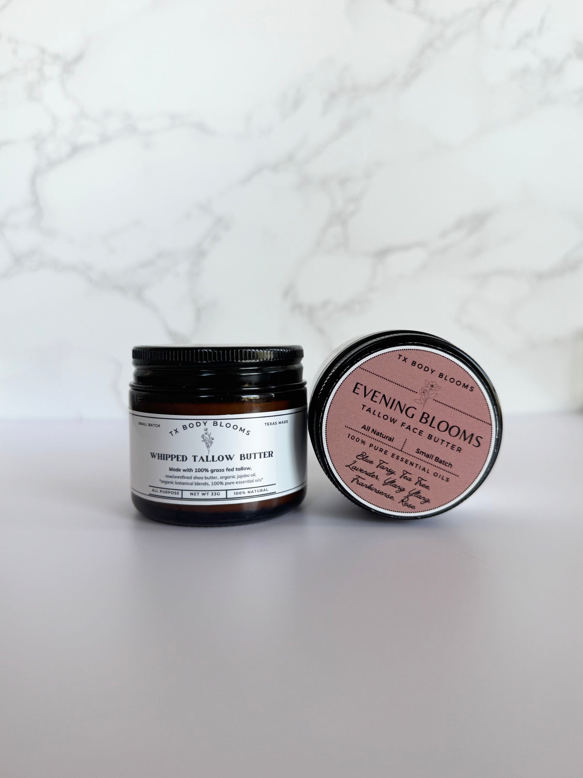 Settle down after a long day, with your face's favorite nightly ritual! Our Evening Blooms face tallow is a luxurious blend that soothes, repairs, and hydrates your skin, all while you sleep!